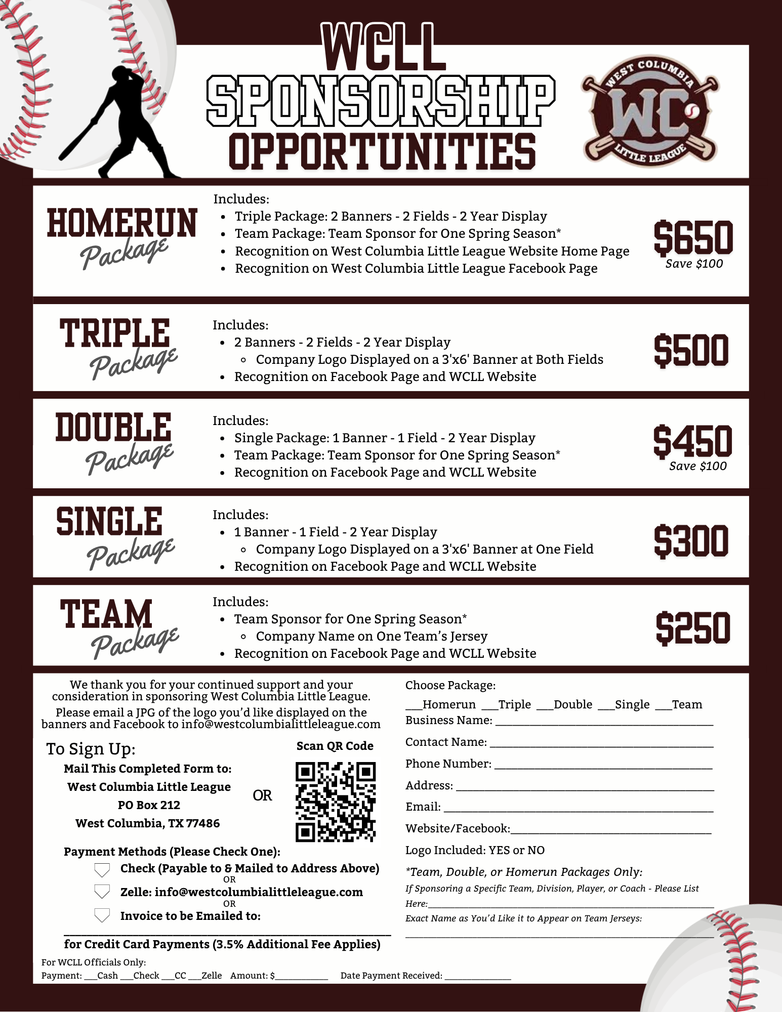 West Columbia Little League (WCLL) is preparing for our Spring Season, and we would be honored to invite you to join us as a sponsor. Each year, our league relies on the support of local businesses and community leaders to provide a safe, positive, and memorable baseball program for our youth. WCLL continues to grow and better it's facilities because of our sponsors.
